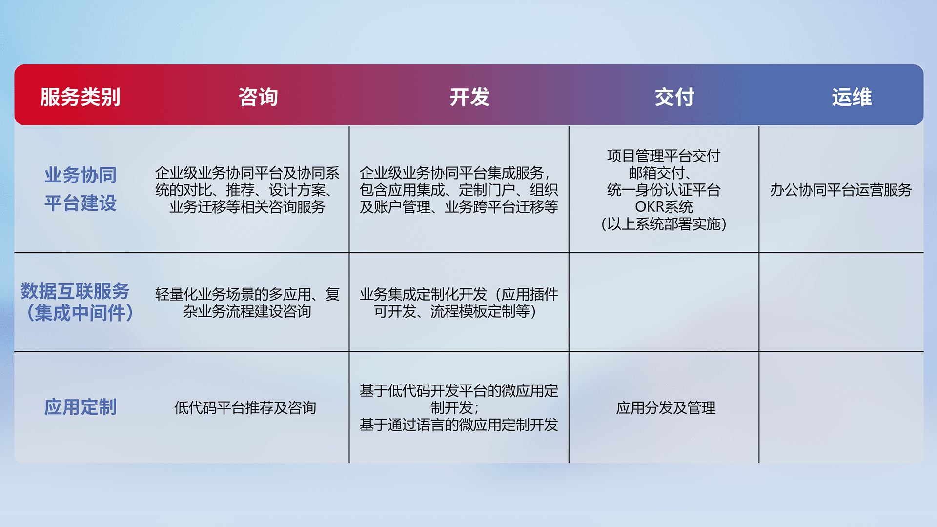 针对钉钉、、、企微、、IDaas等平台级产品提供产品的规划、、、、方案、、、、交付、、、、定制化开发等服务,,,实现如统一协同办公、、智能客户服务、、、、混合会议管理、、智能数据查询、、等业务场景,,,,实现数字化转型。。。